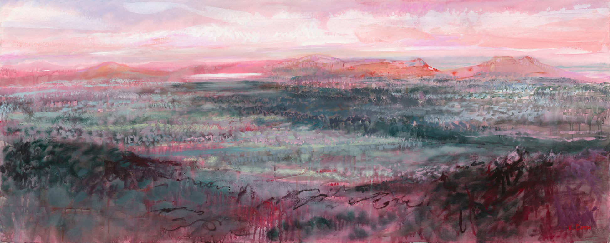 Cunninghams Gap has a dream-like quality produced with layers of melting colour and a free expressive brush-stroke.