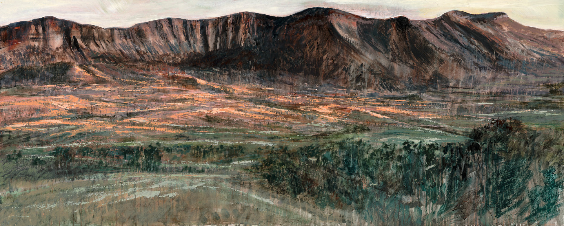 Scenic Rim is a textured, acrylic painting that uses techniques of sgrafitto and glazing to obtain an etched-like appearance.